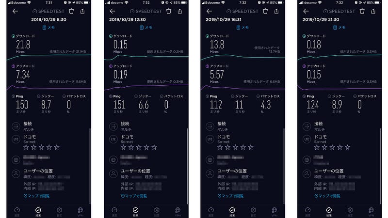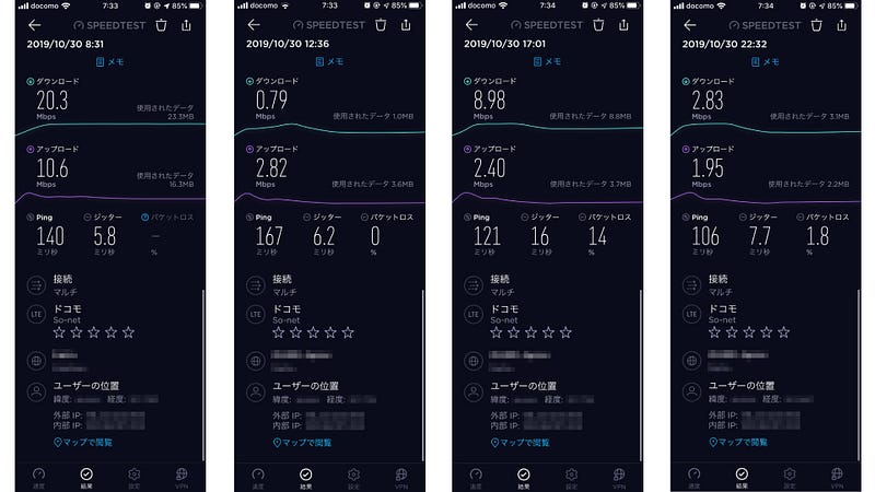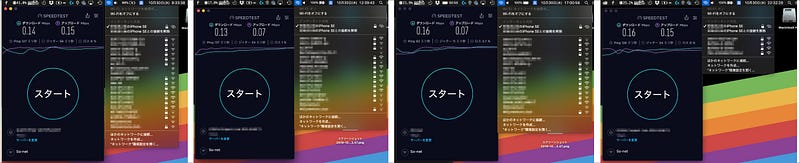 ↑は左から8:31、12:36、17:01、22:32に先程のテザリング時にMacの方でスピードテスト計測した直後にiPhoneで計測した結果です。