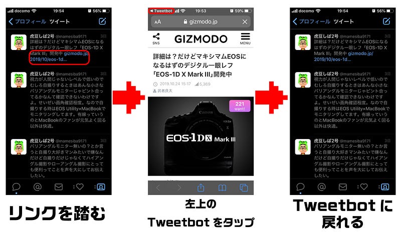 一例として挙げると朝食食べる時にTwitterを見るんですけど、その際左上にTweetbotと記されています。これはTweetbotで流れてきたツイートに添付されてるURLをSafariで開いた状態です。左上にあるTweetbotという文字を押すとまたTweetbotに戻ることが出来る機能で、これを結構多用するのですがこれがiPhone 7だと押せない!