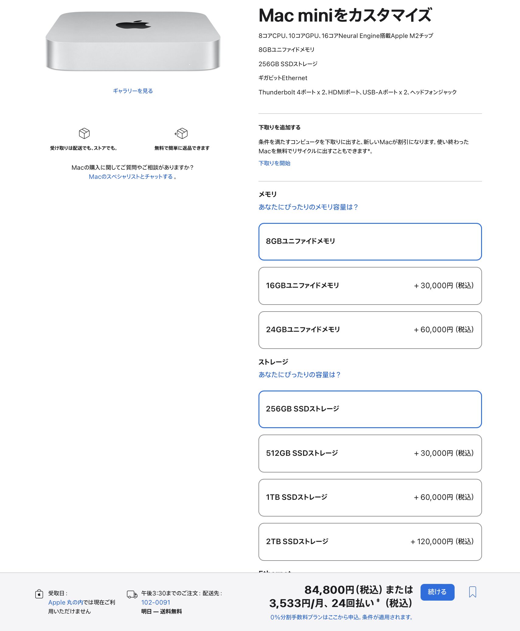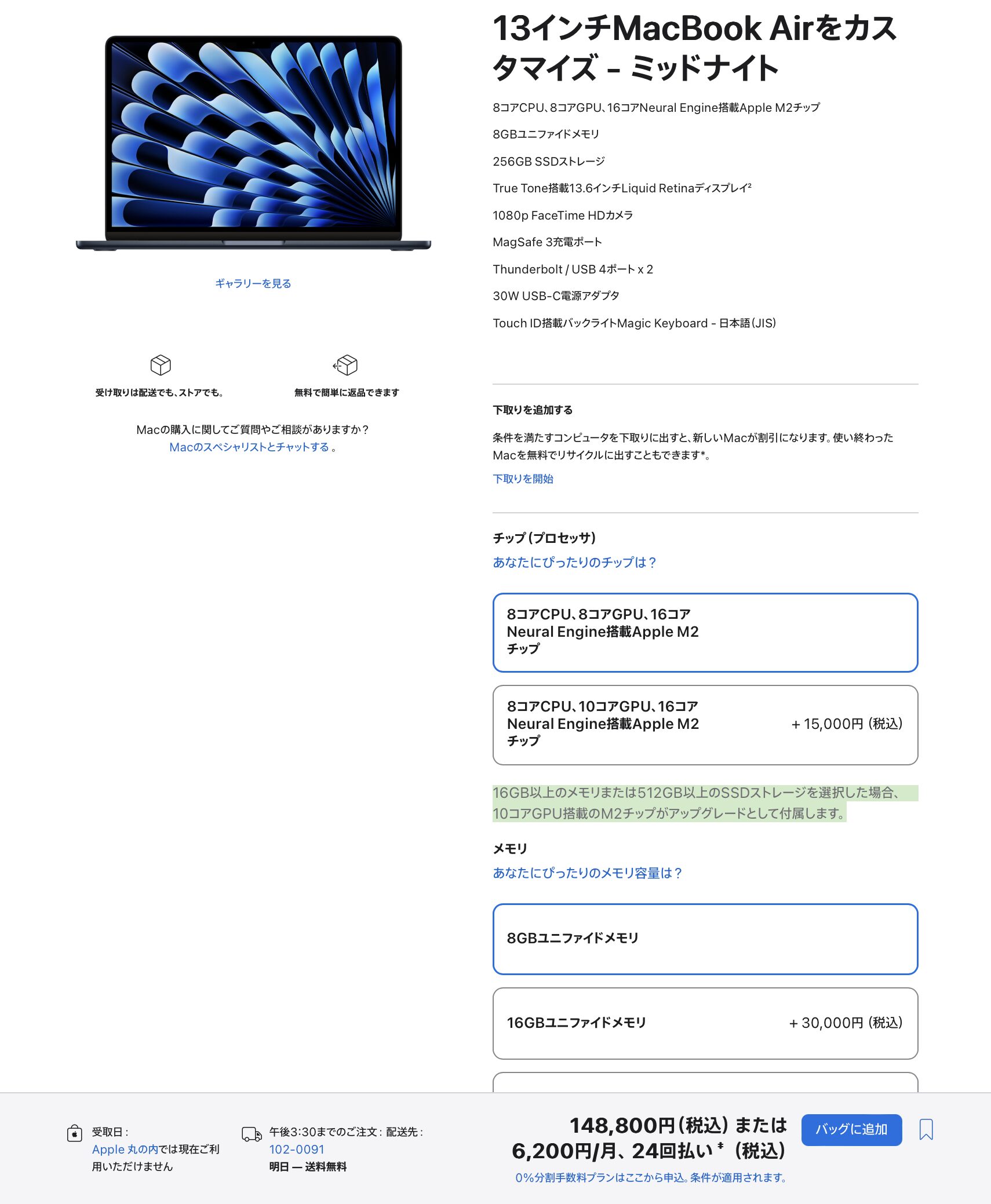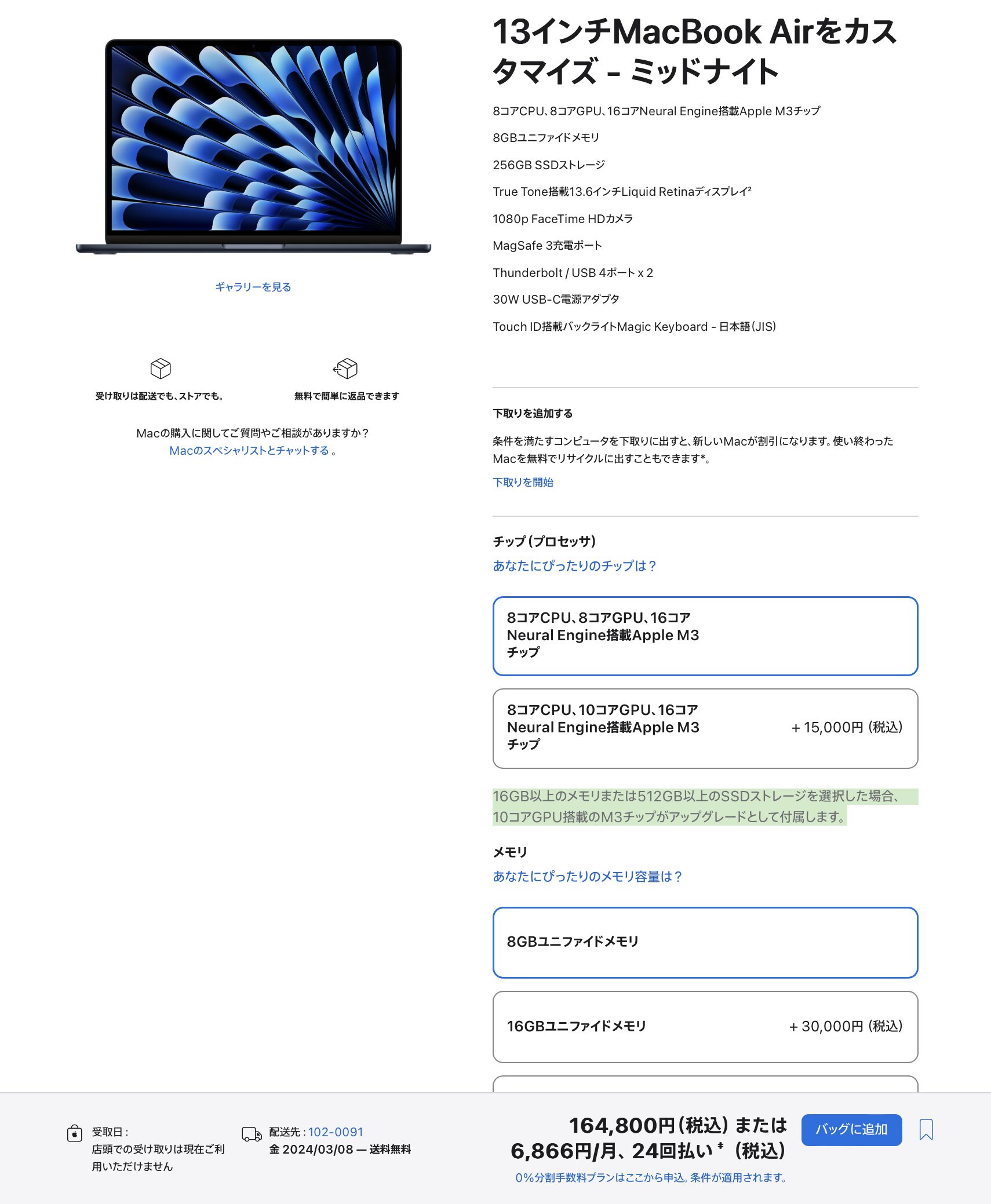 なので逆で考えると8コアGPUモデルは8GBユニファイドメモリと256GBストレージの組み合わせでしか実現しないということですね。
