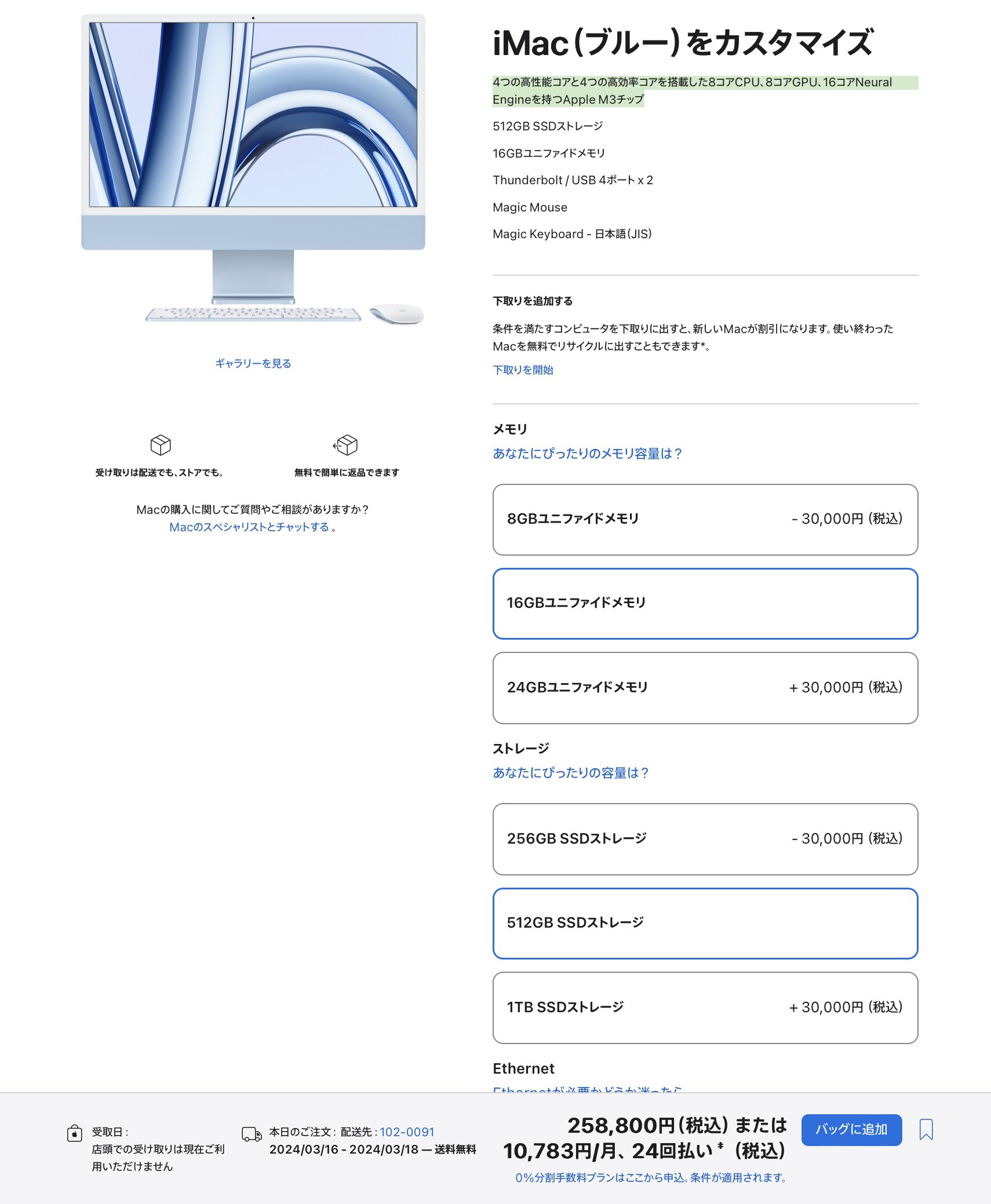 M3無印チップを搭載したMacで言うと、昨年11月に登場したiMac 24inchがありますが、こちらは引き続きベースモデルの8コアGPUを維持したままユニファイドメモリやストレージのカスタマイズが可能なんですね。